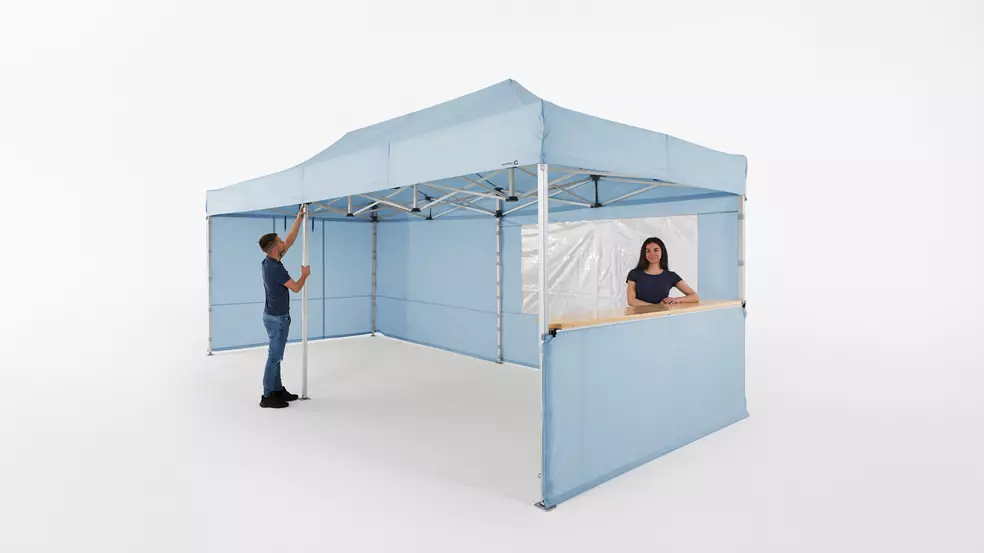 The ice blue pop up gazebo can be purchased in three very popular sizes: 3x3 m, 3x4.5 m and 3x6 m. In addition, the textile can be ordered for all sidewalls with Velcro. The textile itself is a special edition and therefore limited. While others make up the crowd with white or black gazebos, you can easily stand out like a snowy mountain.